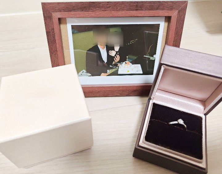 写真はプロポーズをしたお店からのプレゼントと二人で選んだ婚約指輪です。